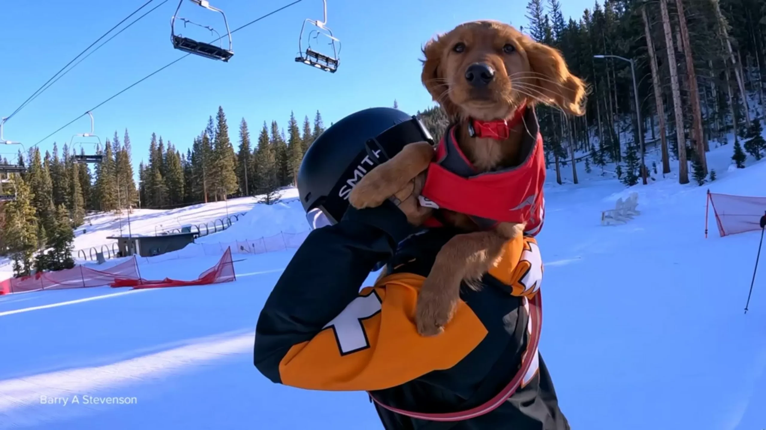 WATCH: Puppy training for avalanche rescues rides the slopes on ski patroller’s shoulders